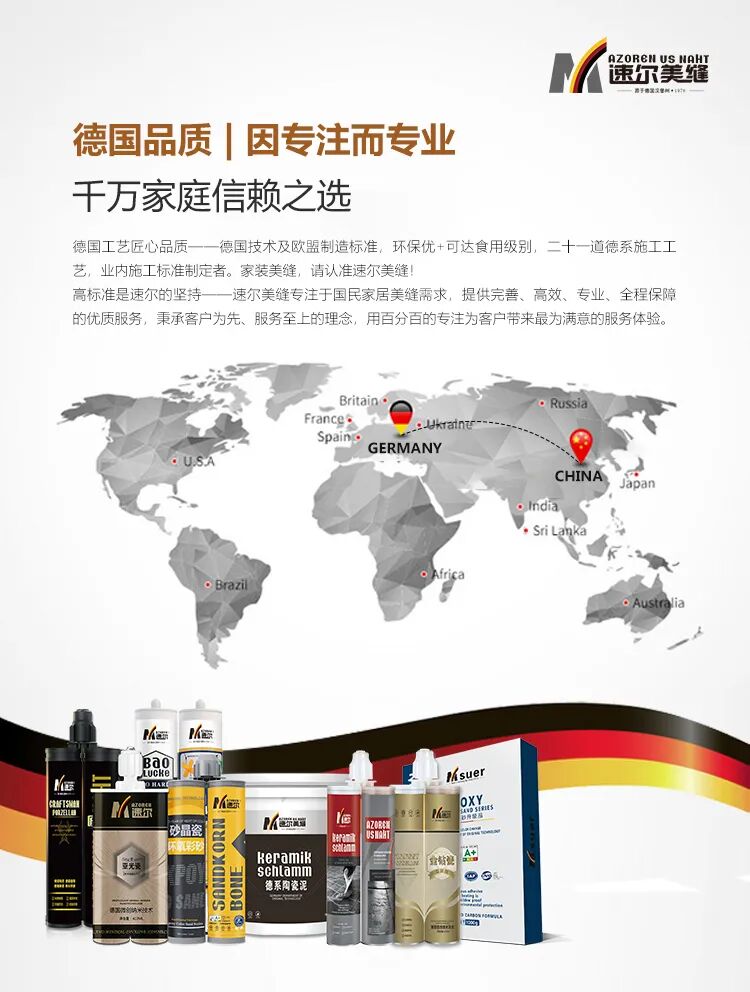 展示范围:美缝剂、环氧彩砂、聚脲美缝、收边美容胶产品及原材料、施工配套工具等。
