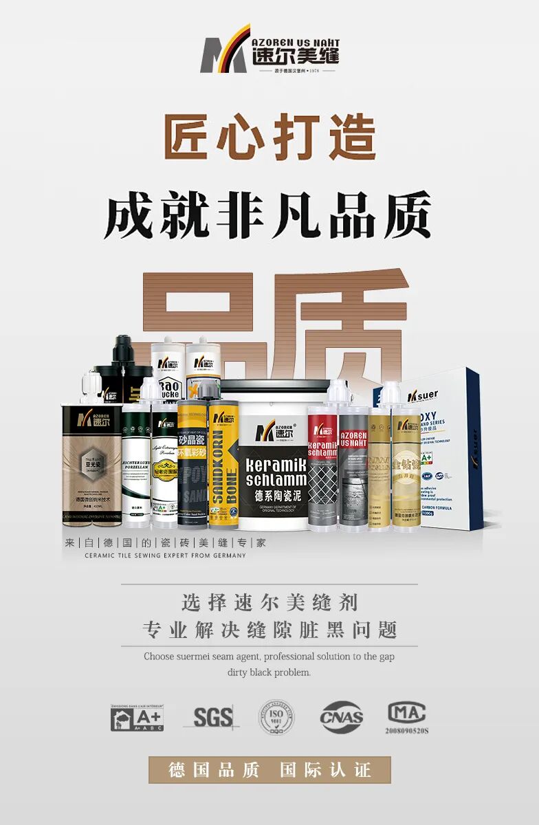 全新推出的速尔美缝轻奢瓷(聚脲),采用高科技新材料——聚脲,舍弃一切杂质瑕疵,不含变色基因,能有效应对紫外线,耐黄性能更持久!从根本上解决美缝黄变难题,让瓷砖缝隙持久保持本色不变色。为业主带来卓越的美缝效果,尽显品质。